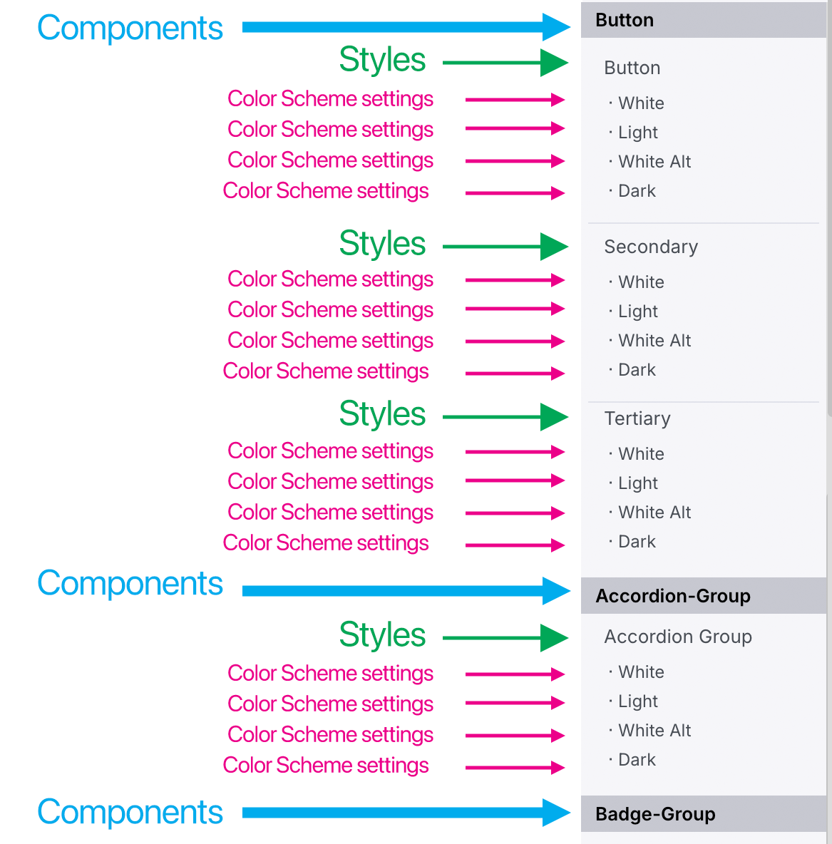 "Button" for example is a component type you can add to a page. When you add a Button component to a page you may apply different styles, in this case "Button", "Secondary", and "Tertiary". For each of those styles you can set the color scheme settings.